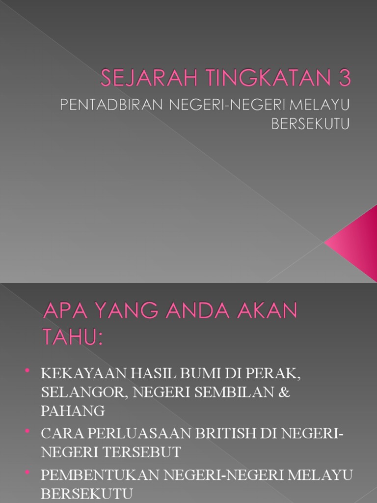 The world economic depression after world war i led a negative impact on the british. Berlaku pemusatan kuasa di tangan residen jeneral di kuala lumpur.kuasa sultan/raja semakin lemah dan berpusat pada agama islam dan adat istiadat melayu sahaja.kerajaan negeri kehilangan kuasa perundangan dan pentadbiran.segala keputusan penting diputuskan oleh residen. Sistem ini dilaksanakan oleh pihak british pada tahun 1895 dan ia bertahan sehingga tahun 1946. Penduduk di wilayah tabal berhijrah ke kelantan kerana. Sejarah tingkatan 3 adam asmaca.