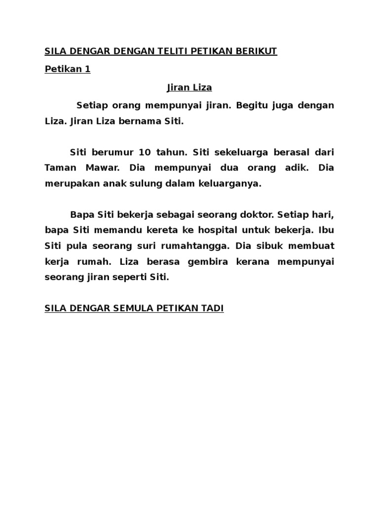 Ujian berbentuk tanya jawab secara lisan. Proses memperolehi atau menjadikan sebahagian atau semua bahan daripada sampah untuk diguna semula. Semua elemen yang dinyatakan dalam rakaman mesti ditulis semula dalam jawapan untuk mendapat markah penuh sebagai bukti pelajar mendengar dengan baik. Ulbs kelas ukm (fasa ii). Ujian lisan bertutur bahasa melayu ini terbahagi kepada dua iaitu. Hujah lisan adalah pemahaman dan penaakulan menggunakan konsep dirangka dalam perkataan. Ujian lisan dan bertutur ini akan dikenakan pada dua subjek iaitu subjek bahasa melayu dan subjek bahasa inggeris. Ujian lisan bahasa melayu untuk calon persendirian. Ii dan iii skema jawapan ujian lisan bahasa melayu petikan 1. Ia bertujuan untuk menilai keupayaan untuk berfikir secara membina, dan bukannya kefasihan mudah atau pengiktirafan perbendaharaan kata. Sasbadi online 3 years ago. Ujian lisan bertutur dan ujian lisan mendengar. (tertakluk kepada pindaan oleh lpm).