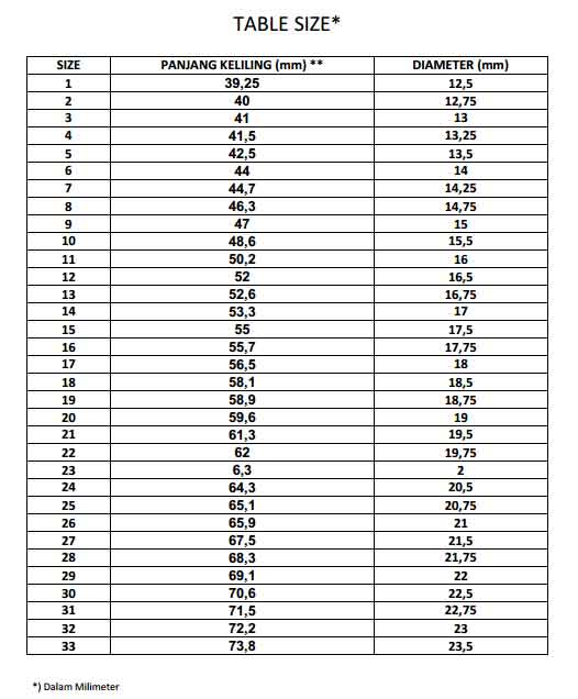 Hasil pengukuran kertas diatas cocokan dengan daftar ukuran cincin dibawah ini : Kalau tak dapat pergi emas atau mahu membeli barang kemas secara online saiz cincin ini penting untuk terdapat dua cara iaitu dengan menggunakan ukur lilit jari dan kedua menggunakan cincin contoh. Gunakan penggaris untuk mengukur di tepi. Ini merupakan cara yang paling mudah untuk mendapatkan ukuran cincin yang sesuai. Cara ini sangat tepat sekali karena langsung dengan patokan cincinnya. Ada 2 cara mudah untuk mengukur cincin. Selain cara pertama, ada lagi cara menentukan ukuran cincin yang lebih mudah dan praktis, yaitu dengan bagaimana, mudah bukan mengukur ukuran jari anda sendiri? Jangan menggunakan seutas tali atau benang metode ini hanya berlaku jika anda memiliki sebuah cincin yang sudah sesuai dengan jari yang sama. Sehingga nantinya cincin yang anda pesan bisa sesuai dengan jari, tidak kekecilan ataupun kebesaran. Bandingkan pengukuran ini terhadap tabel di bawah untuk. Setelah menemukan ukuran cincin anda, ini saatnya untuk memilih model cincin yang sesuai dengan gaya dan karakter anda. Biasanya pada saat itu lingkar jari akan berada pada posisi kamu bisa memanfaatkan cincin tersebut untuk mengetahui ukuran cincinmu. Pertimbangkan hal ini ketika menentukan ukuran.
