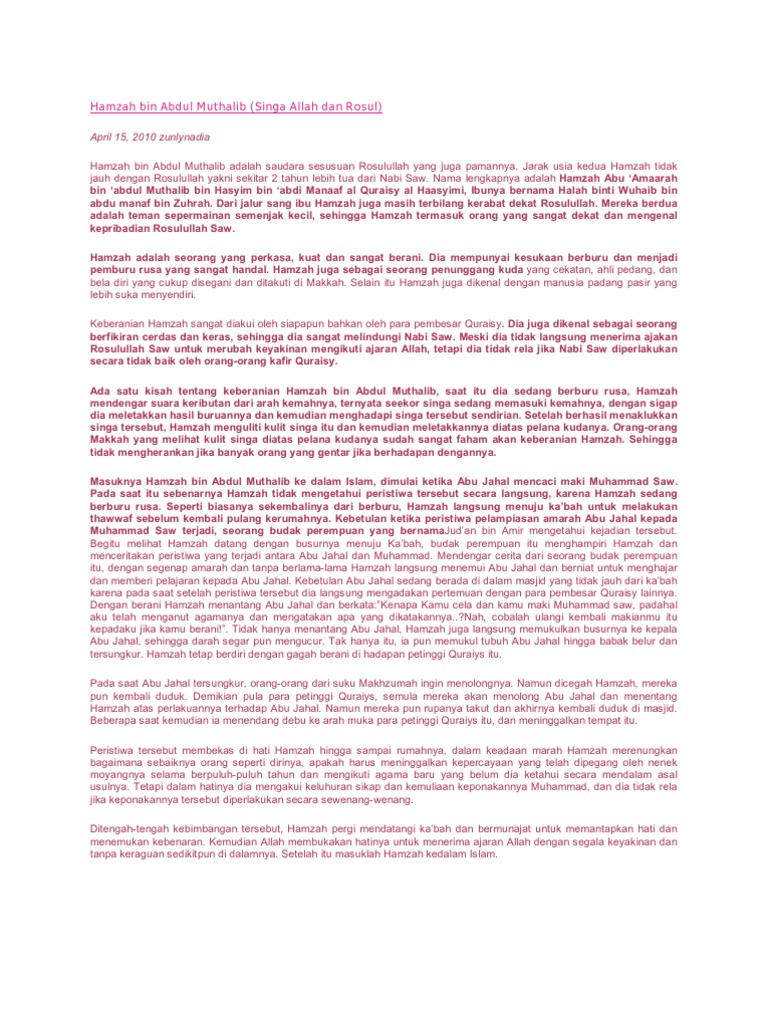 To connect with hamzah, sign up for facebook today. Saat siksaan kepada kaum muslimin semakin keras, allah memberikan penguatan. Ia gugur dalam pertempuran di uhud. Hamzah bin abdul muthalib merupakan pejuang terdepan kaum muslimin dalam mubârazah atau perang tanding atau duel. Biodata saidina hamzah bin abdul mutalib.